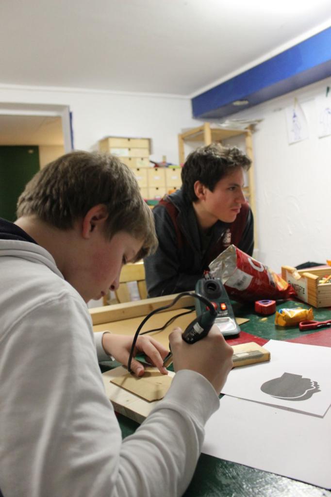 Projekt Werwolf: Mit viel Kreativität, Multiplex Platten und Lötkolben basteln die Pfadis Holzkarten für ihr Lieblings Spiel.