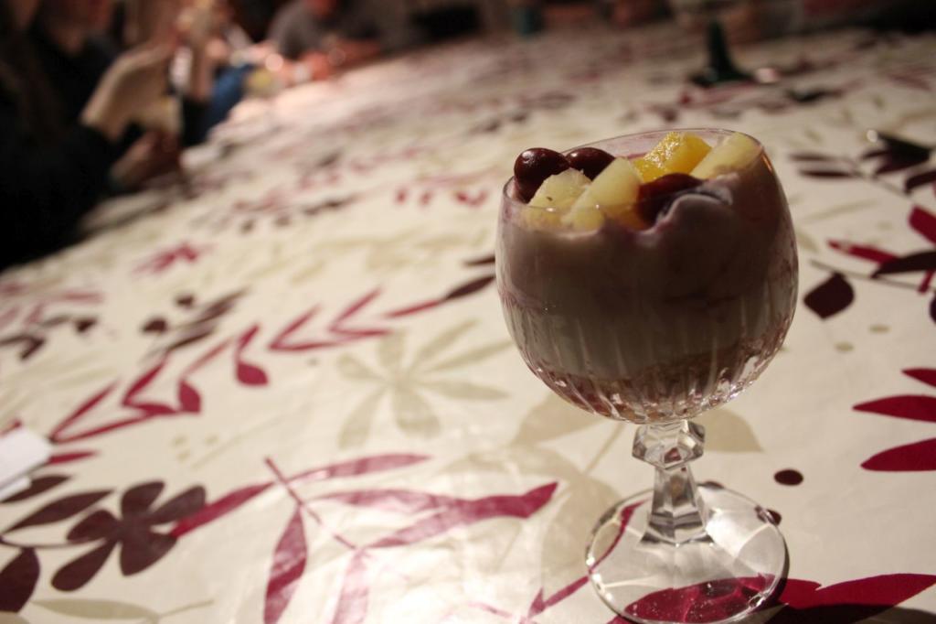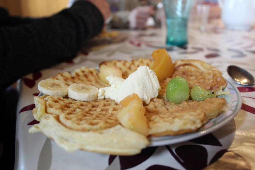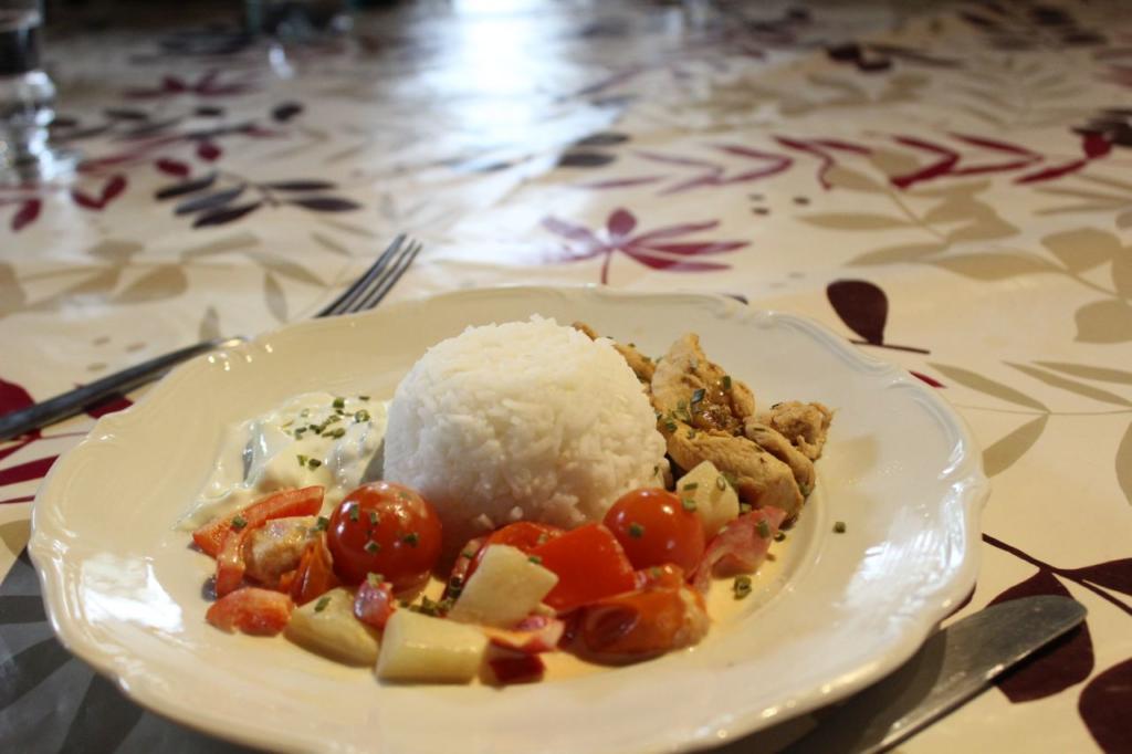 Dieses Menü wollte die Gruppe fürs Mittagessen natürlich toppen und servierte Hähnchenbrust mit einer Tomaten-Sahne-Soße, Zaziki und Reis und als Nachtisch Waffeln mit Eis und Früchten.