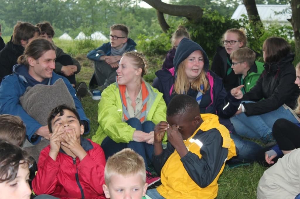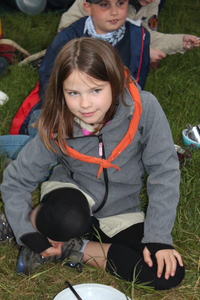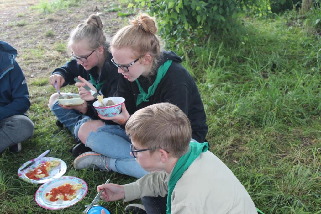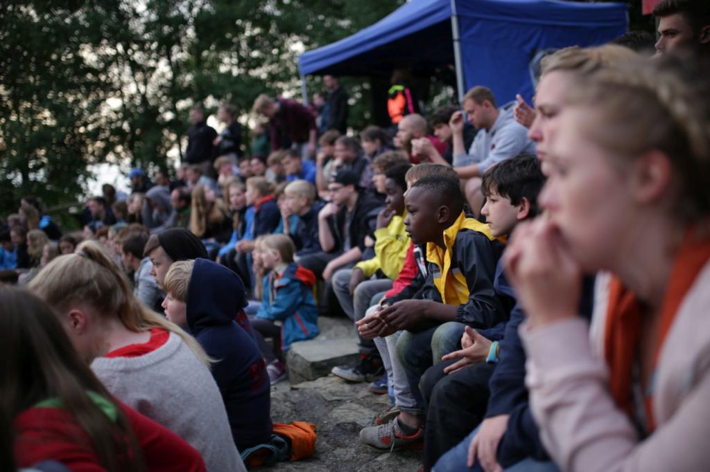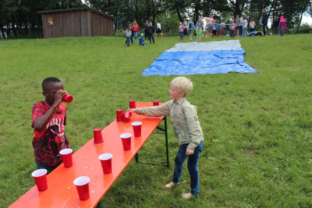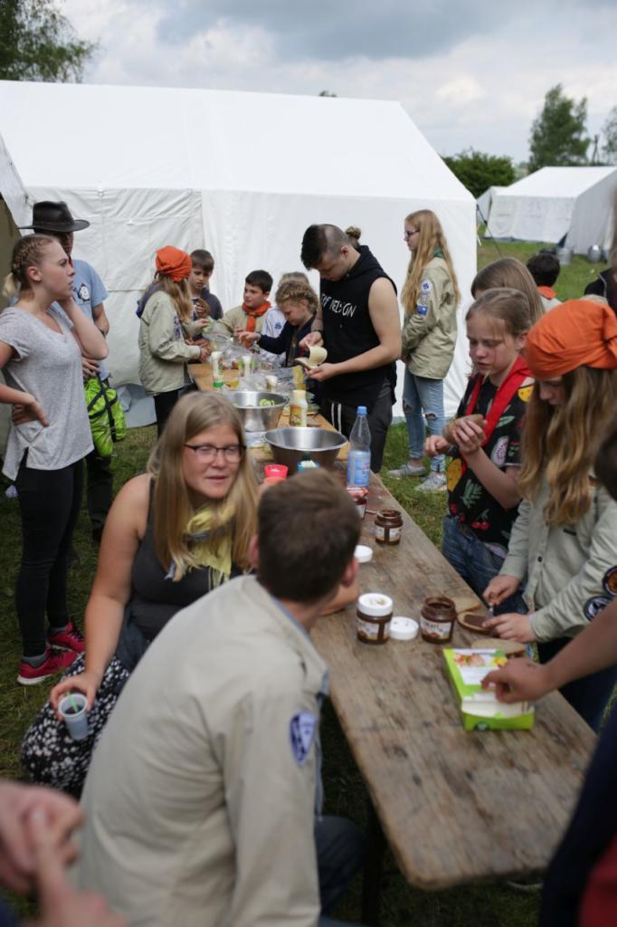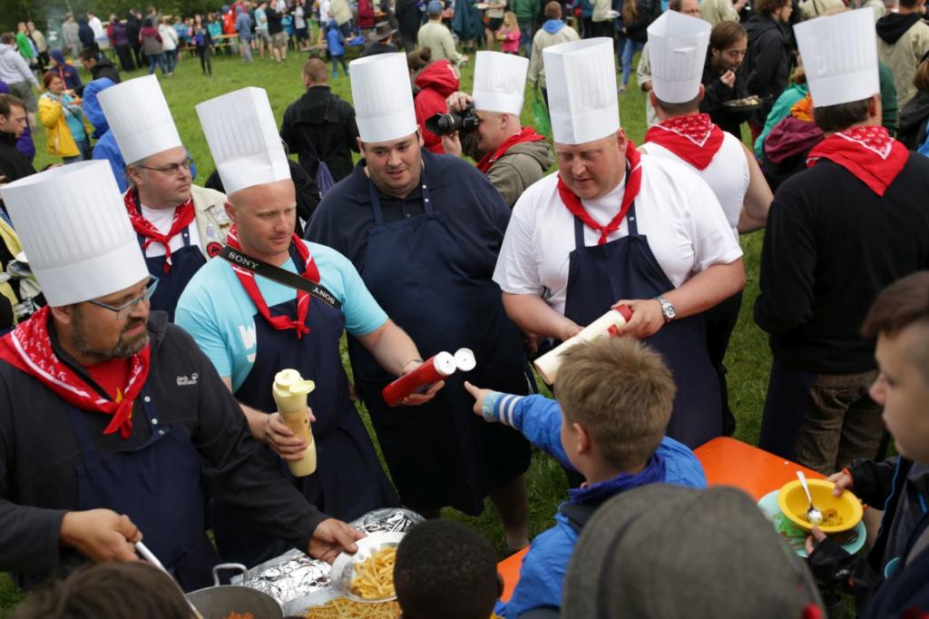 Nachmittags haben wir dann mal frei. Kinder und Leiter vergnügen sich mit Ball- oder Kartenspielen oder liegen faul in der Wiese um sich auf die Party am Abend vorzubereiten. Erfreulicherweise bleibt es fast trocken, erst als der letzte Programmpunkt ansteht fängt es wieder an zu regnen. Jeder Stamm bereitet ein Essen für ein großes Buffet vor und anschließend essen alle Teilnehmer gemeinsam. Es gibt Leckereien aus der ganzen Welt: Gulasch, Pasta, Curry, Chilli con Carne, Borschtsch, Köttbullar und noch viel mehr. Es ist für jeden etwas dabei.