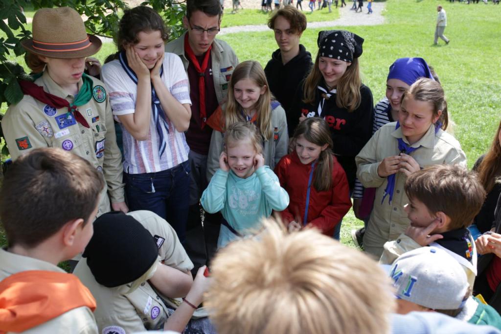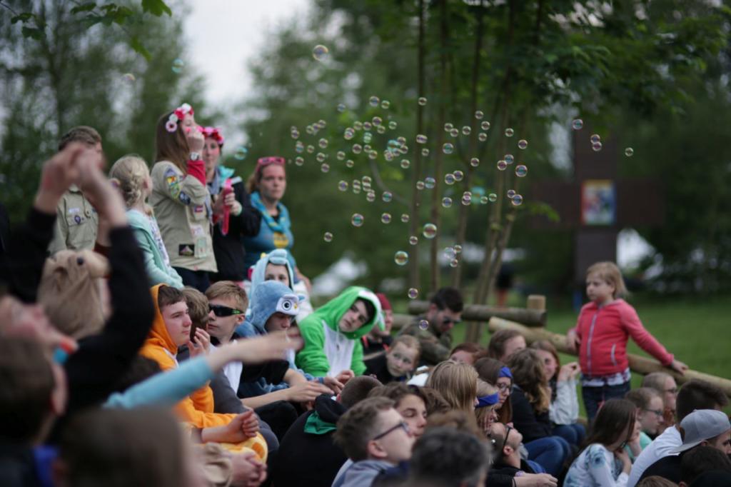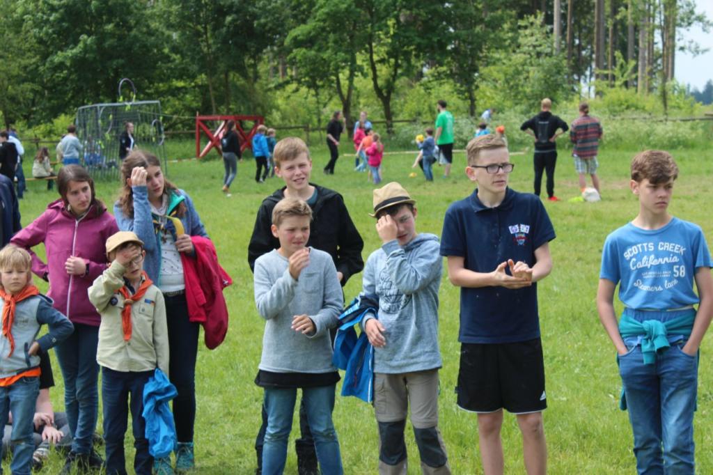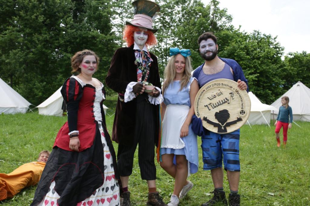 Samstag: Samstag ist Programmtag. Morgens führt uns das Wurmloch auf der Suche nach Timmy in das Wunderland der Alice. Dort muss die Herzkönigin mit ihren Kriegern besiegt werden. Das Geländespiel mit über 600 Pfadfindern im Wald läuft problemlos ab. Nach dem Mittagessen sucht uns schon wieder ein Gewitter heim und das Programm muss erstmal pausieren. Doch irgendwann geht es mit etwas Verzögerung weiter. Leider ist aber das Wurmloch kaputt gegangen und es müssen vier Ersatzteile beschafft werden. Zum Glück ist auf die vier Stufen Verlass und alle konnten am Ende des Stufenprogramms ihre Komponente präsentieren. Die Wös spielen ein riesiges Stationsspiel mit über 10 verschiedenen lustigen Spielchen. Die Juffis gehen wieder in den Wald um sich dort richtig auszutoben. Die Pfadis müssen diverse knifflige Aufgaben lösen um erfolgreich zu sein. Die Rover vergnügen sich mit einer laaangen Rutschplane, holen sich dafür aber auch einige Zecken ab.
