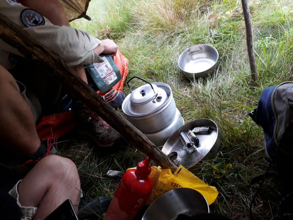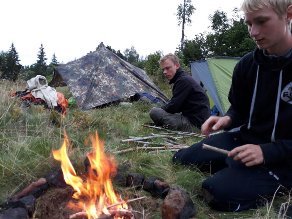 Dabei haben wir einen tierischen Wegbegleiter gefunden, ein Hund, welcher uns ca. 3 km begleitete. Unser Lager für die Nacht haben wir auf einer Hügelspitze in der Wildnis aufgeschlagen, wo wir uns ein Festmahl aus Tütennudeln bereitet haben, und jetzt den Regen aussitzen. Dabei genießen wir eine Runde von dem Spiel, was uns in Rage bringt.