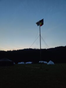 So früh stand der Bannermast in den letzten Jahren selten. Doch heute gelang es uns, unsere wunderbaren Flaggen in luftiger Höhe (14-15 Schritte) zu hissen. Dies gelang treu dem pfadfinderischen Ansatz “Learning by Doing” schon im zweiten Versuch.