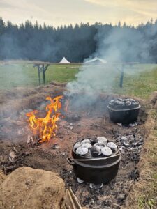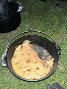 Pünktlich zur Errichtung war dann auch der Nachtisch fertig: ein köstlicher Apple-Crumble aus dem Dutch Oven. Davor gab es leckere, vegetarische Burger. Zitat des Tages: