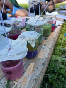Heute starten wir endlich ins klassische Standlager mit Programm! Bei bestem Wetter besuchten uns die drei ??? auf dem Lagerplatz und erzählten uns von ihrem neusten Fall: die Firma Testlé scheint Umweltverschmutzung und Greenwashing zu betreiben. Um uns ein bisschen mit dem Thema Nachhaltigkeit auseinanderzusetzen, probierten wir in Workshops viele neue Dinge aus: Kerzen gießen, Bienenwachstücher herstellen, T-Shirts batiken, Gefühlskarten basteln und einiges mehr.