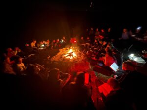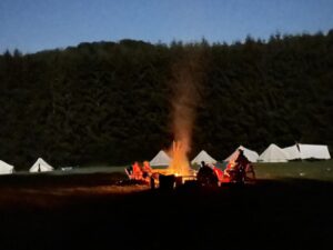 Nachdem am Samstag die Pfadis und Wös zum Lagerplatz zurückgekehrt sind, konnte am Sonntag ausgeschlafen und gemütlich in den Tag gestartet werden. Während wir mit letzten Lagerbauten beschäftigt waren, erreichten auch die Juffis unser Zuhause für die nächsten zwei Wochen. Alle Rucksäcke wurden ausgepackt, Hikezelte im Materialzelt verstaut und sich gemütlich im Zelt und unter der Plane eingerichtet. Abends veranstalteten wir einen lauschigen Lagerfeuerabend, bei dem die Stufen auf kreative Art von ihren Touren berichteten.