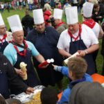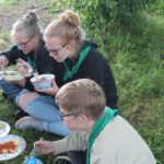 Nachmittags haben wir dann mal frei. Kinder und Leiter vergnügen sich mit Ball- oder Kartenspielen oder liegen faul in der Wiese um sich auf die Party am Abend vorzubereiten. Erfreulicherweise bleibt es fast trocken, erst als der letzte Programmpunkt ansteht fängt es wieder an zu regnen. Jeder Stamm bereitet ein Essen für ein großes Buffet vor und anschließend essen alle Teilnehmer gemeinsam. Es gibt Leckereien aus der ganzen Welt: Gulasch, Pasta, Curry, Chilli con Carne, Borschtsch, Köttbullar und noch viel mehr. Es ist für jeden etwas dabei.