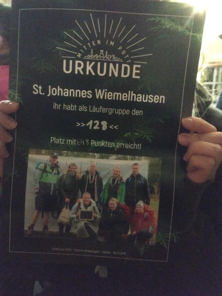 Über 1000 Verrückte haben sich die letzten Tage in Herne getroffen um am diesjährigen Ironscout teilzunehmen. Entweder als Stationsteam oder als Läufergruppe. 8 Leiter aus Wiemelhausen waren auch als Läufer am Start, und nach knapp 20 Stunden auch wieder im Ziel. 22 Stunden hatte man Zeit möglichst viele Stationen im Ruhrpott abzulaufen, die besten Teams der 142 angetretenen Gruppen schafften stolze 12 Stationen. Wir begnügten uns bei unserem ersten Auftritt mit der Hälfte. Dennoch führte uns unser Weg durch Castrop-Rauxel, Dortmund, Bochum und Herne. Knapp 40km reichten am Ende trotzdem “nur” für den 128. Rang, wir sind trotzdem zufrieden.